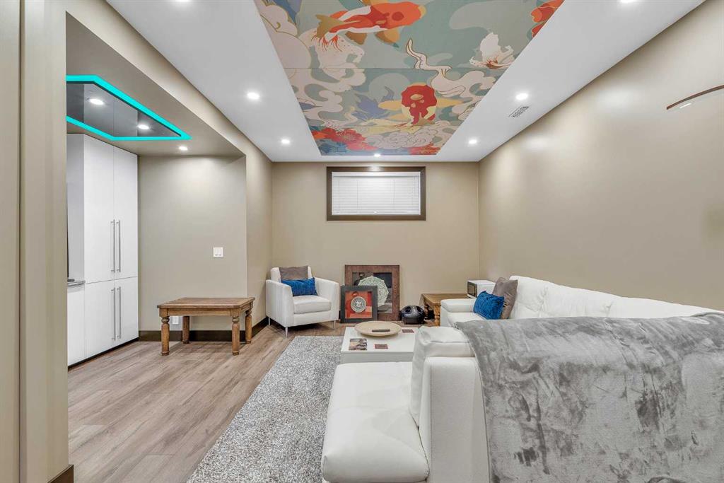 Downstairs, the spacious basement bedroom stands out with custom detailing and thoughtful design. A beautifully finished four-piece bathroom and custom ceiling panels—easily removable—enhance the space while maintaining excellent access to storage.