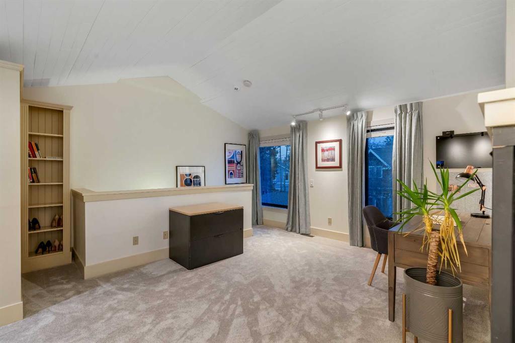 The entire top floor is dedicated to a private primary retreat with vaulted ceilings, a sitting area with double-sided fireplace, a spa-inspired ensuite, dual walk-in closets, additional linen cabinetry, and a separate office space ideal for working from home in complete privacy.