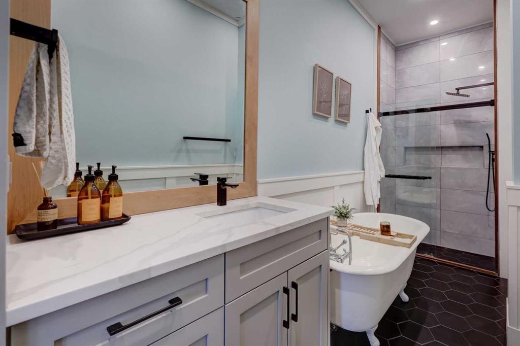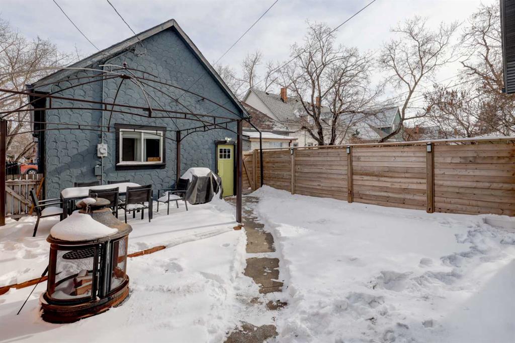 Cherished for over a century, this truly unique home seamlessly blends historic character with modern upgrades and conveniences. The residence has been lovingly updated ensuring the best elements of its past remain preserved while introducing features that enhance comfort and functionality. The kitchen stands out as a focal point, offering dramatic floor-to-ceiling, two-tone custom cabinetry, quartz countertops, and a stainless steel appliance package that includes a stunning gas range. Subway tile accents the space, complemented by a convenient pantry and dedicated microwave/appliance coffee station for added organization and enjoyment. Easy-care vinyl plank flooring, updated paint, and trim further brighten the open plan, making every square foot count. The living/dining area features a built-in library, wainscoting, and a coffered ceiling—details reminiscent of days gone by that contribute to the home’s enduring charm. Natural light streams through updated windows, highlighting the high ceilings. Modern touches such as pot lights and ceiling fans have been added for comfort and ambience. The primary bedroom includes a cheater door to an exquisitely renovated bathroom showcasing beautiful tile flooring, a refinished clawfoot tub, tiled shower, and a custom vanity with quartz countertop. The second bedroom, currently serving as an office, offers a custom closet with a barn door closure. The porch has been updated with electric heat, lighting, and outlets, making it a flexible space to personalize according to your lifestyle. Additional upgrades include a 60-gallon hot water tank, Lennox high-efficiency furnace, updated shingles, and eavestroughs, providing peace of mind. In 2023, an oversized, fully insulated, heated, and fully finished double detached garage (22’ 2” x 23’3”) was constructed with all required permits. The garage features 100-amp service, is pre-wired and plumbed for a gas heater, and offers extra electric outlets—including a switched plug facing the street for block heaters or chargers. This space is ideal for car enthusiasts, adding unexpected value and convenience. The home is situated on a picturesque, tree-lined street in one of Calgary’s oldest and most iconic communities, known for its walkability and bike-friendliness. Whether you enjoy walks along the River, peaceful moments at the Inglewood Bird Sanctuary, or the vibrant atmosphere of local shops and restaurants, you will find it nearby. For those who desire the excitement of downtown living without the constraints of apartment life, this home is an ideal choice. This substantially updated home, rich in character and modern amenities, offers a rare opportunity in a sought-after Calgary neighborhood. Book your private viewing with your favorite agent and discover the unique charm and value of this special property.