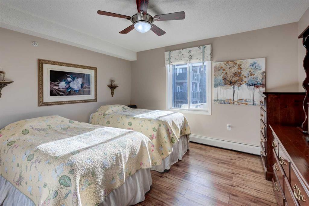 Premium location for this bright, spacious 3rd-floor end unit with no neighbours above! One of the largest units in this well-managed Adult 60+ community, this 2-bedroom, 2-bathroom home offers an excellent open-concept layout with extra South and West facing windows flooding the home with an abundance of natural light. The U-shaped kitchen is generous in size with granite countertops, a large peninsula, white cabinets and pull-outs, and newer stainless-steel appliances. The living and dining areas feature a large open space for added comfort and ambiance, along with electronic blinds and laminate flooring running throughout most of the unit. The primary bedroom includes a private 4-piece ensuite with walk thru closet, while a 3-piece main bath is perfect for guests off the second bedroom. Additional highlights include a large covered balcony, tiled entry, in-suite storage with newer stand-up washer and dryer, jacuzzi tub, towel warmer, quartz bathroom countertops, and a titled heated underground parking stall. Enjoy an exceptionally active and welcoming community or simply relax in the comfort of your own home. Building amenities span multiple floors and include a dining room, Café Bistro, lounge, craft room, exercise room, hair salon, library, guest suite, rooftop, and a carwash. Did I mention a chef Mon-Fri for dinner? Condo fees include heat, water, and electricity. A mandatory $75/month dining fee applies for weekday meals. Public transit is conveniently located , with shopping, restaurants, and health services just steps away. The LRT station is adjacent to the complex, making commuting effortless. This impressive unit truly offers comfort, convenience, and community…a must-see!