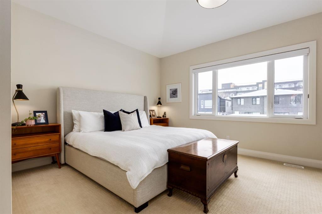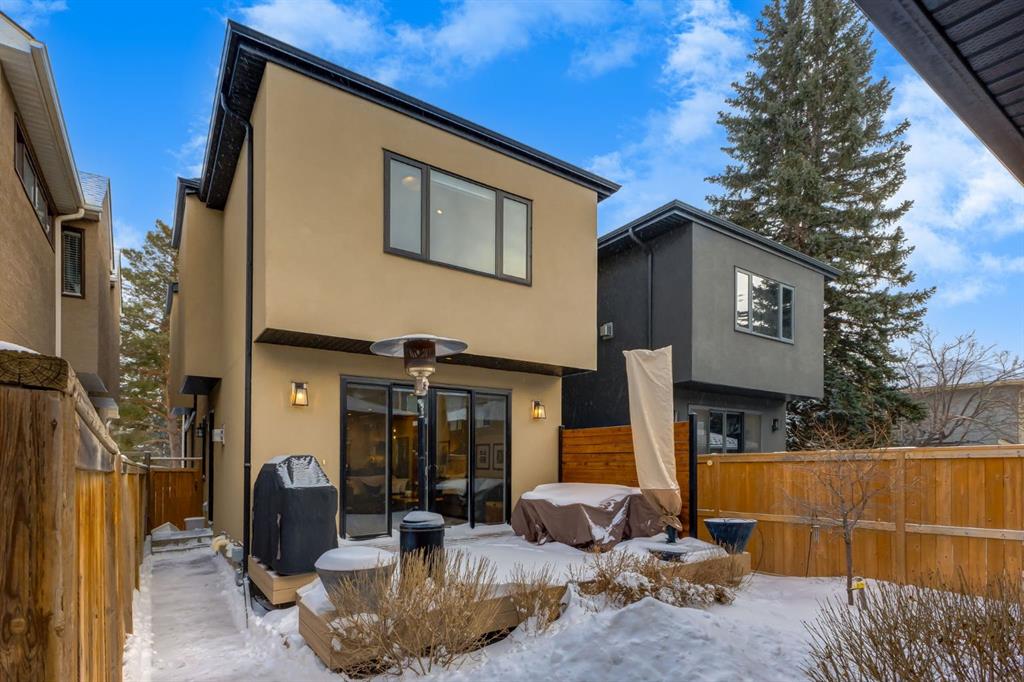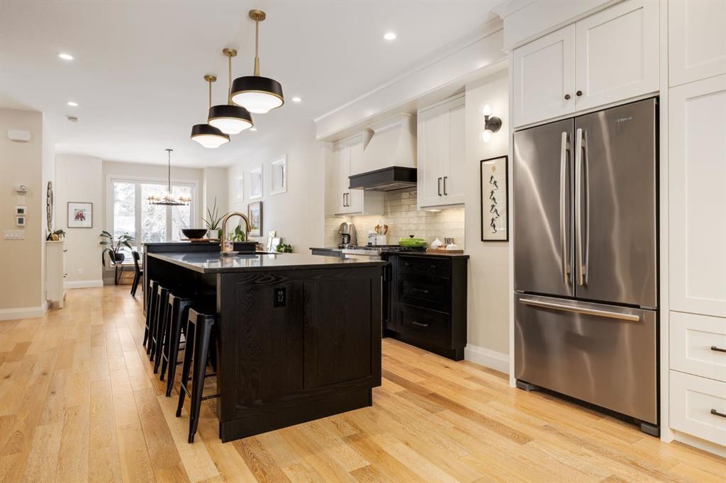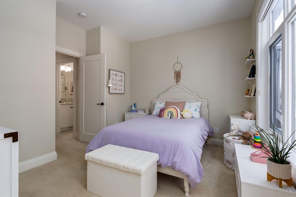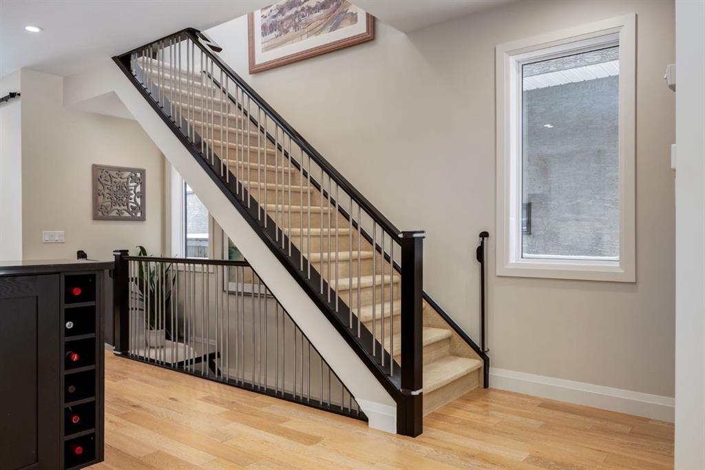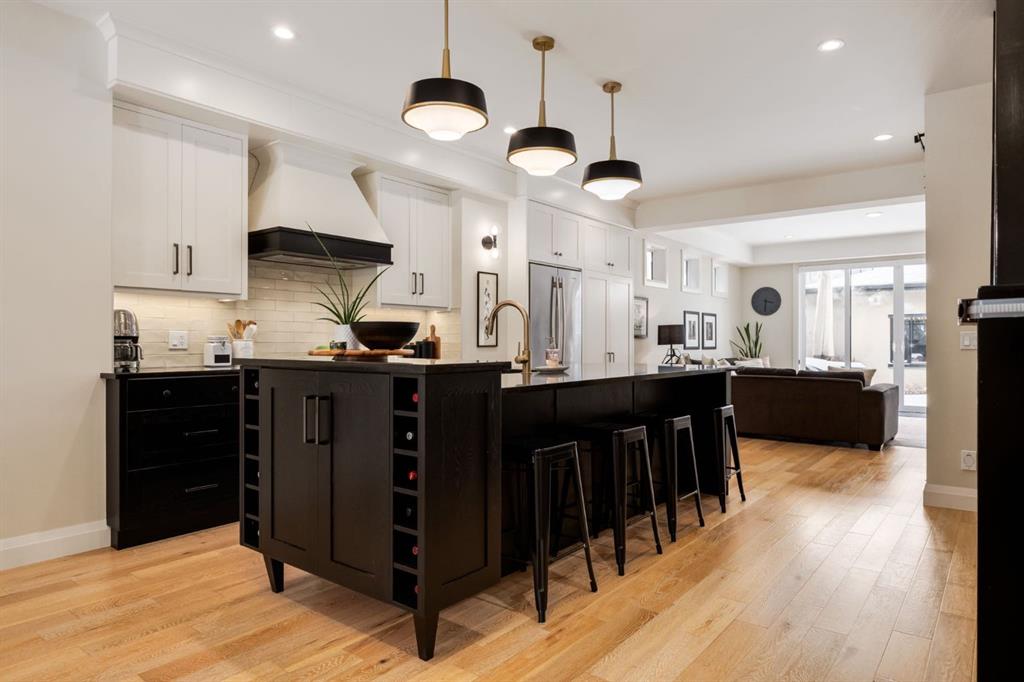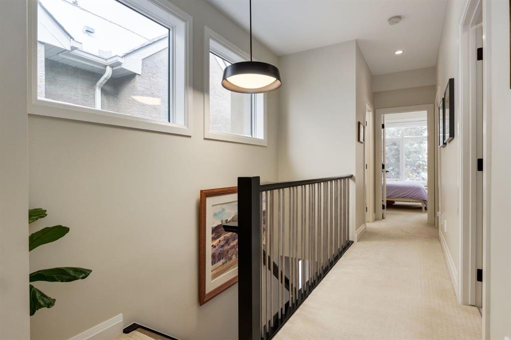 Open House Sun, Feb 22, 2-4pm. Located in highly coveted Shaganappi, this detached home was expertly built with quality in mind, no expense sparred, and a timeless elegance that will never go out of style. This stunning 4-bedroom, 3.5 bath home affords you a luxurious lifestyle and a quick walk to two LRT stations and endless amenities. Ditch the cheap materials used in most modern infills and upgrade to high end supplies including solid wood cabinetry and millwork as well as custom window coverings, central AC, a heated garage, and manicured landscaping including composite decking, mature perennials, and garden beds. As you walk up the front steps, the stunning curb appeal of this home stands out with classic white brick complimented by stone and metal accents. You’re greeted through the entryway into the barely lived in, open concept main floor which boasts engineered wood floors, soaring ceilings, designer lighting, and spectacular natural light through many expansive windows. The massive kitchen is fit for a large family with solid wood cabinetry, a custom range hood, gas stove, enormous kitchen island with bar seating, wine storage, and a pull-out pantry, all of which is accented by designer pendant lighting, ambient wall sconces, and an ageless backsplash. Enjoy family gatherings in your spacious dining room under a spectacular chandelier with mature trees lending privacy outside of the bright front windows. The large living room is flooded with natural light through floor to ceiling glass sliding doors and additional transom windows and is warmed by a striking gas fireplace with subway tile surround, adorned by a crafted mantle. Step outside onto the west facing composite deck to relax and enjoy the sunshine in your private, west facing backyard with landscaping including mature perennials and garden beds. Enjoy a moody mud room with a hexagonal tile accent wall and gold hardware. Rear entry from the garage is possible through your side mud room with built in storage including a bench with hooks, perfect for a bustling family. Enjoy elegant open railings as you ascend to the upper level which includes 3 beautiful skylights and large windows. The primary retreat has vaulted ceilings, west facing windows, and a large walk-in-closet with built-ins. The newly remodelled, luxurious spa-like ensuite showcases a free-standing tub that’s flooded in natural light, dual sinks with tons of extra storage, and a beautifully tiled stand-up shower with bench seating. Upstairs features two generously sized kid’s bedrooms allowing room for larger furniture and space to play. The kids’ bedrooms share a stunning 4-piece bathroom. Enjoy an upstairs laundry room with custom millwork, quartz countertops and tiled backsplash, endless storage, and a must-have sink. Downstairs boast a huge media space with a bespoke wet bar and wine fridge, office space, playroom, and room for guests with an additional large bedroom and a 3 -piece bathroom matching the finishes you’ve come to expect.