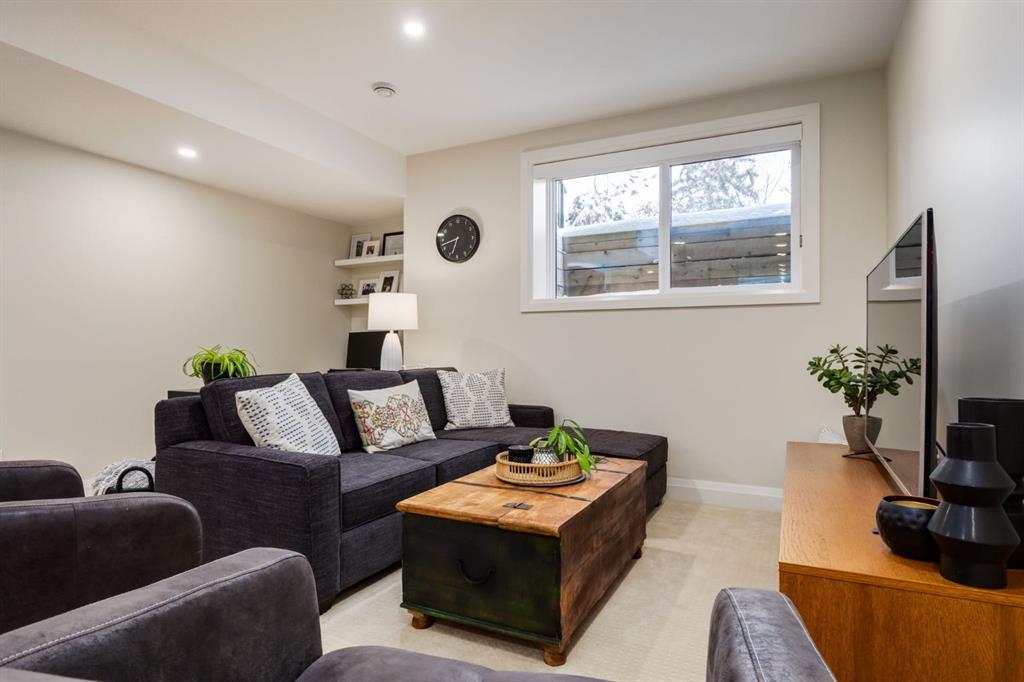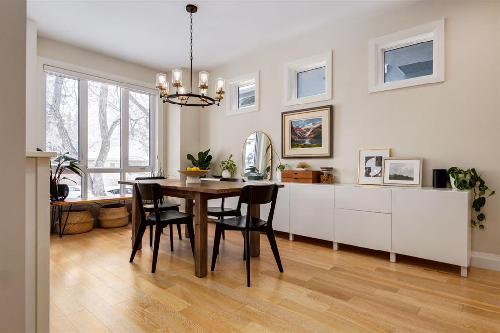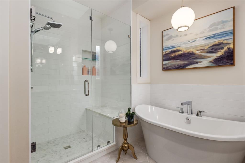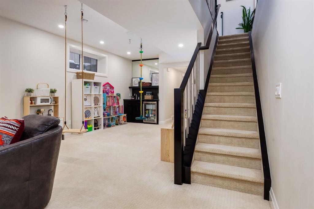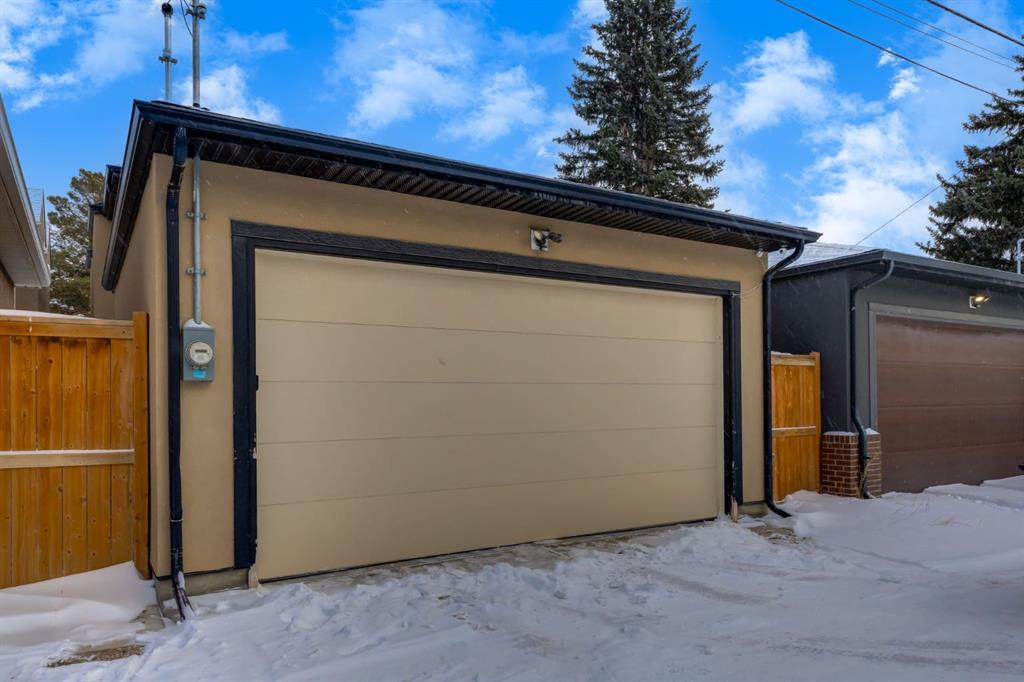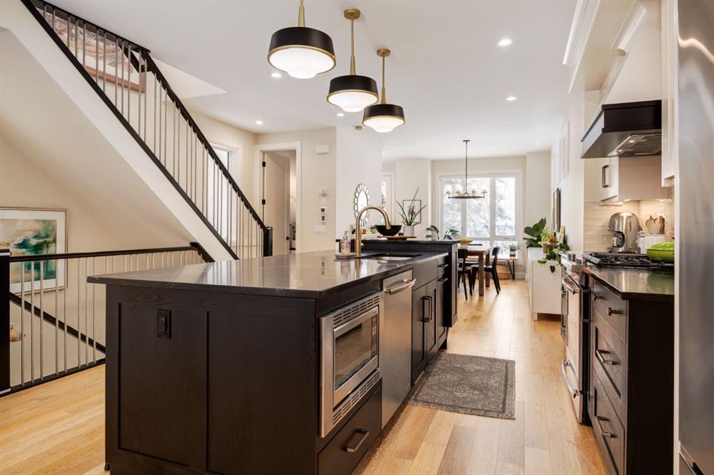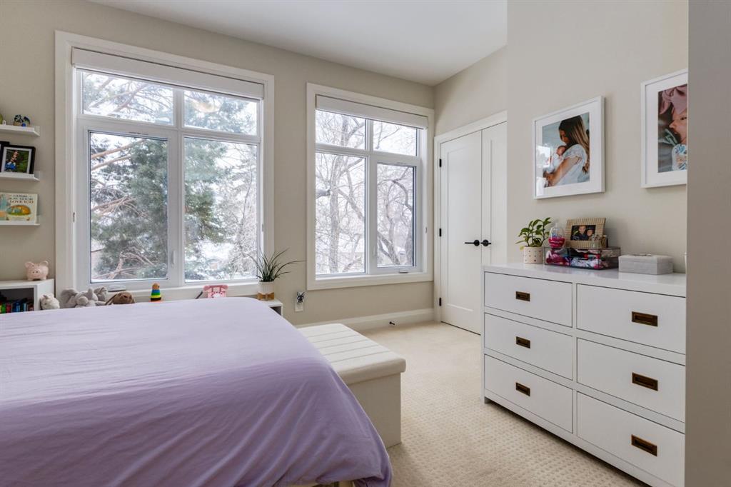 Open House Sun, Feb 22, 2-4pm. Located in highly coveted Shaganappi, this detached home was expertly built with quality in mind, no expense sparred, and a timeless elegance that will never go out of style. This stunning 4-bedroom, 3.5 bath home affords you a luxurious lifestyle and a quick walk to two LRT stations and endless amenities. Ditch the cheap materials used in most modern infills and upgrade to high end supplies including solid wood cabinetry and millwork as well as custom window coverings, central AC, a heated garage, and manicured landscaping including composite decking, mature perennials, and garden beds. As you walk up the front steps, the stunning curb appeal of this home stands out with classic white brick complimented by stone and metal accents. You’re greeted through the entryway into the barely lived in, open concept main floor which boasts engineered wood floors, soaring ceilings, designer lighting, and spectacular natural light through many expansive windows. The massive kitchen is fit for a large family with solid wood cabinetry, a custom range hood, gas stove, enormous kitchen island with bar seating, wine storage, and a pull-out pantry, all of which is accented by designer pendant lighting, ambient wall sconces, and an ageless backsplash. Enjoy family gatherings in your spacious dining room under a spectacular chandelier with mature trees lending privacy outside of the bright front windows. The large living room is flooded with natural light through floor to ceiling glass sliding doors and additional transom windows and is warmed by a striking gas fireplace with subway tile surround, adorned by a crafted mantle. Step outside onto the west facing composite deck to relax and enjoy the sunshine in your private, west facing backyard with landscaping including mature perennials and garden beds. Enjoy a moody mud room with a hexagonal tile accent wall and gold hardware. Rear entry from the garage is possible through your side mud room with built in storage including a bench with hooks, perfect for a bustling family. Enjoy elegant open railings as you ascend to the upper level which includes 3 beautiful skylights and large windows. The primary retreat has vaulted ceilings, west facing windows, and a large walk-in-closet with built-ins. The newly remodelled, luxurious spa-like ensuite showcases a free-standing tub that’s flooded in natural light, dual sinks with tons of extra storage, and a beautifully tiled stand-up shower with bench seating. Upstairs features two generously sized kid’s bedrooms allowing room for larger furniture and space to play. The kids’ bedrooms share a stunning 4-piece bathroom. Enjoy an upstairs laundry room with custom millwork, quartz countertops and tiled backsplash, endless storage, and a must-have sink. Downstairs boast a huge media space with a bespoke wet bar and wine fridge, office space, playroom, and room for guests with an additional large bedroom and a 3 -piece bathroom matching the finishes you’ve come to expect.