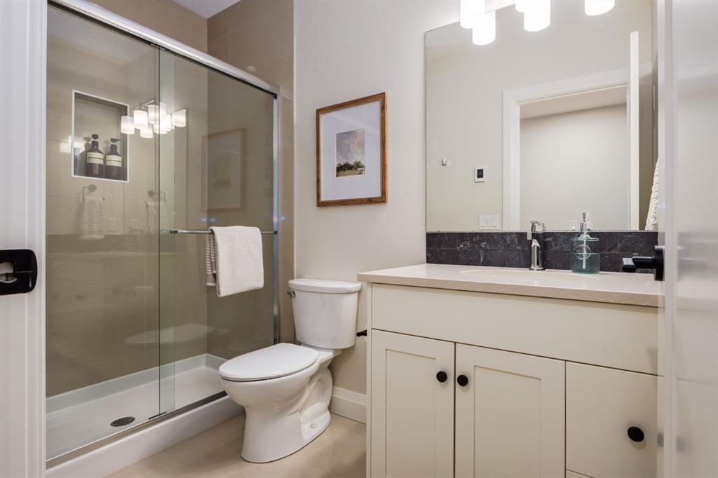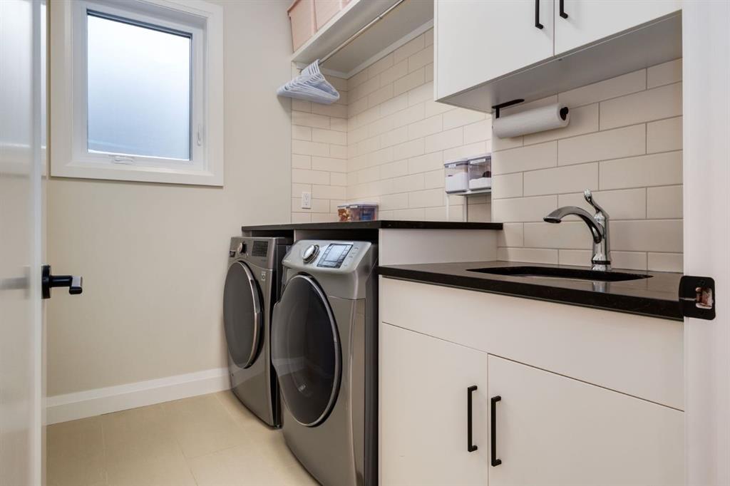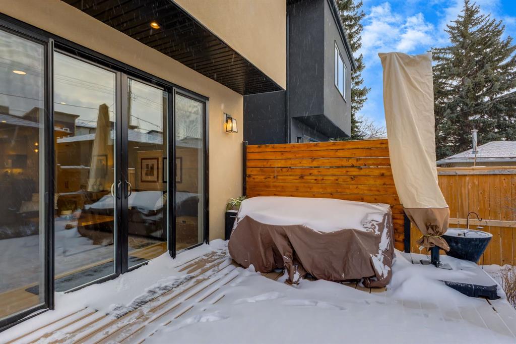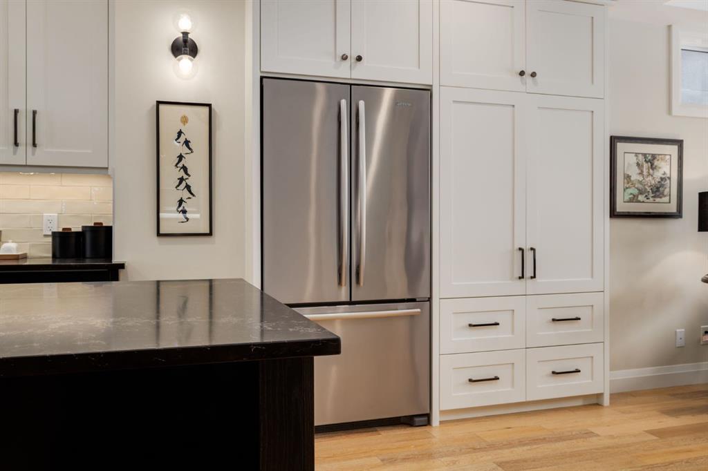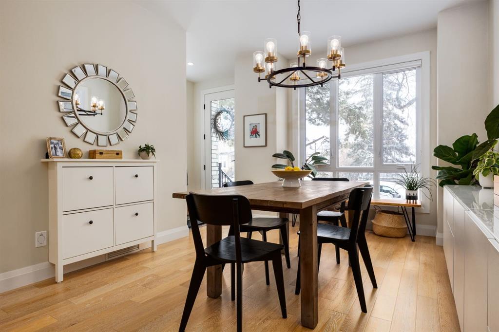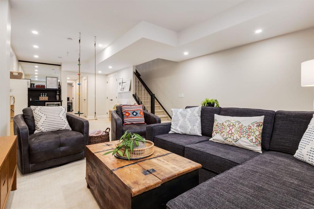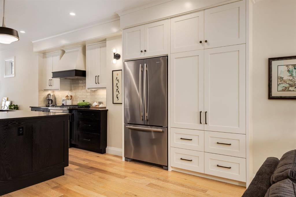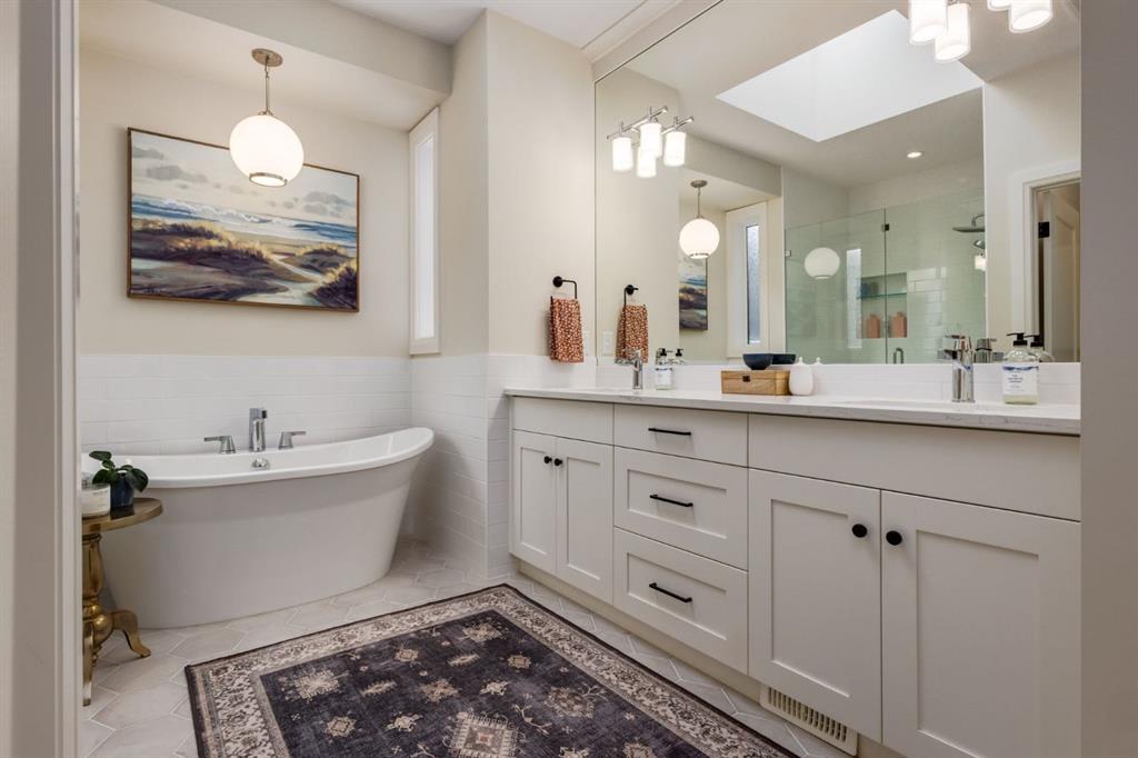 Open House Sun, Feb 22, 2-4pm. Located in highly coveted Shaganappi, this detached home was expertly built with quality in mind, no expense sparred, and a timeless elegance that will never go out of style. This stunning 4-bedroom, 3.5 bath home affords you a luxurious lifestyle and a quick walk to two LRT stations and endless amenities. Ditch the cheap materials used in most modern infills and upgrade to high end supplies including solid wood cabinetry and millwork as well as custom window coverings, central AC, a heated garage, and manicured landscaping including composite decking, mature perennials, and garden beds. As you walk up the front steps, the stunning curb appeal of this home stands out with classic white brick complimented by stone and metal accents. You’re greeted through the entryway into the barely lived in, open concept main floor which boasts engineered wood floors, soaring ceilings, designer lighting, and spectacular natural light through many expansive windows. The massive kitchen is fit for a large family with solid wood cabinetry, a custom range hood, gas stove, enormous kitchen island with bar seating, wine storage, and a pull-out pantry, all of which is accented by designer pendant lighting, ambient wall sconces, and an ageless backsplash. Enjoy family gatherings in your spacious dining room under a spectacular chandelier with mature trees lending privacy outside of the bright front windows. The large living room is flooded with natural light through floor to ceiling glass sliding doors and additional transom windows and is warmed by a striking gas fireplace with subway tile surround, adorned by a crafted mantle. Step outside onto the west facing composite deck to relax and enjoy the sunshine in your private, west facing backyard with landscaping including mature perennials and garden beds. Enjoy a moody mud room with a hexagonal tile accent wall and gold hardware. Rear entry from the garage is possible through your side mud room with built in storage including a bench with hooks, perfect for a bustling family. Enjoy elegant open railings as you ascend to the upper level which includes 3 beautiful skylights and large windows. The primary retreat has vaulted ceilings, west facing windows, and a large walk-in-closet with built-ins. The newly remodelled, luxurious spa-like ensuite showcases a free-standing tub that’s flooded in natural light, dual sinks with tons of extra storage, and a beautifully tiled stand-up shower with bench seating. Upstairs features two generously sized kid’s bedrooms allowing room for larger furniture and space to play. The kids’ bedrooms share a stunning 4-piece bathroom. Enjoy an upstairs laundry room with custom millwork, quartz countertops and tiled backsplash, endless storage, and a must-have sink. Downstairs boast a huge media space with a bespoke wet bar and wine fridge, office space, playroom, and room for guests with an additional large bedroom and a 3 -piece bathroom matching the finishes you’ve come to expect.